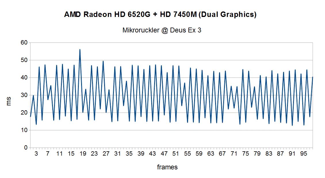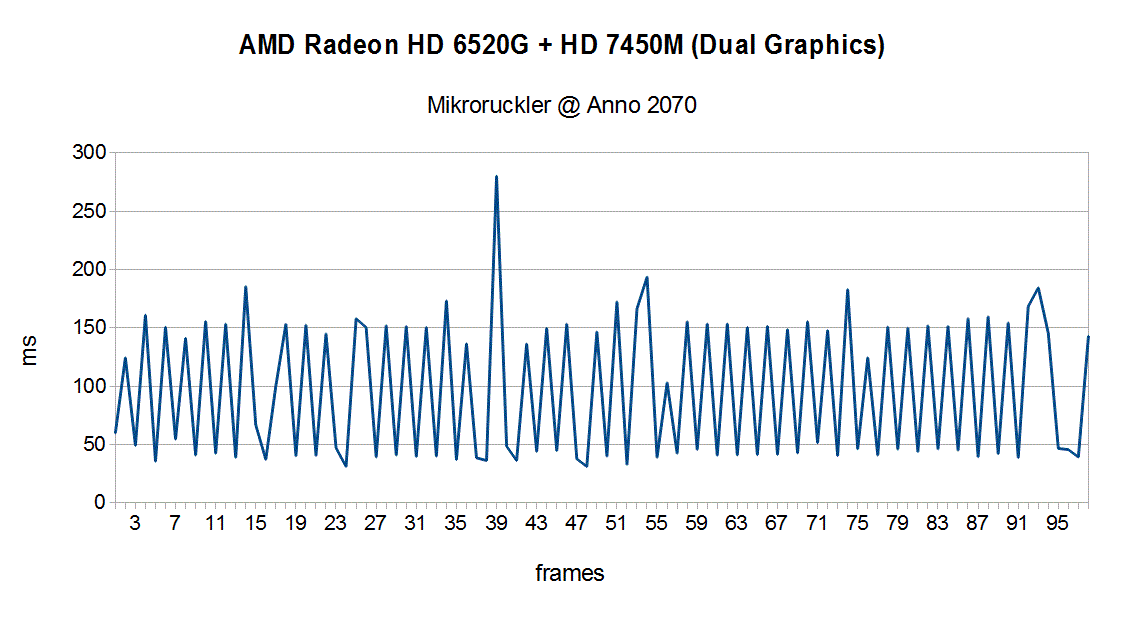 Ein großes Manko von Dual-GPU-Konfigurationen sind die nervigen Mikroruckler. Da sich beide Grafikkarten abwechseln (Alternate Frame Rendering), kann es zu unterschiedlichen Abständen bei der Bildausgabe kommen. Diese sogenannten Mikroruckler sind vor allem im Bereich unter 30 fps wahrnehmbar und zerstören mitunter den Spielfluss. Trotz schlechterer Framerate kann eine einzelne Grafikkarte ein flüssigeres Bild liefern. Tipp: Aktivieren Sie CrossFire nur, wenn ein Spiel auf DirectX 10 oder 11 basiert.