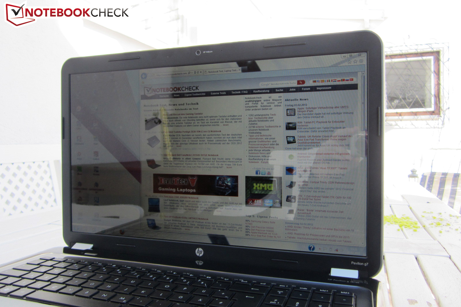 Für den Outdoor-Einsatz ist das Pavilion g7-1353eg denkbar ungeeignet. Die glänzende Oberfläche und die mäßige Leuchtkraft führen zu heftigen Spiegelungen und einem dunklen Bildschirminhalt. Manche Elemente lassen sich nur noch mit Mühe erkennen, ganz zu schweigen von der hohen Augenbelastung. Mobile Nutzer sind bei einem leuchtstarken Non-Glare-Panel wesentlich besser aufgehoben.
