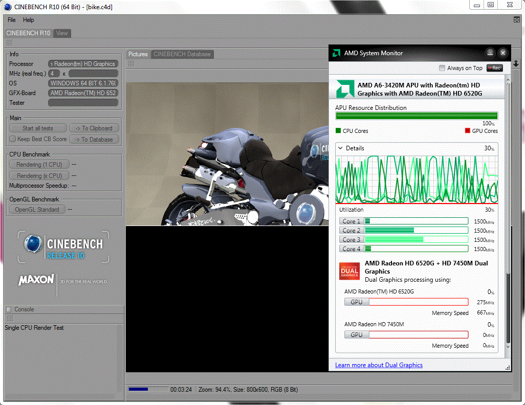 Dank der Turbo-Core-Technologie kann sich der A6-3420M von 1.5 auf maximal 2.4 GHz übertakten. Jedenfalls in der Theorie, denn bei unserem Testgerät war unter Last keine Takterhöhung feststellbar. Egal ob ein einzelner oder mehrere Kerne beansprucht wurden: Die APU lief stets mit mageren 1500 MHz. Wenigstens kam es nicht zu einem Throttling (auch im Stresstest).