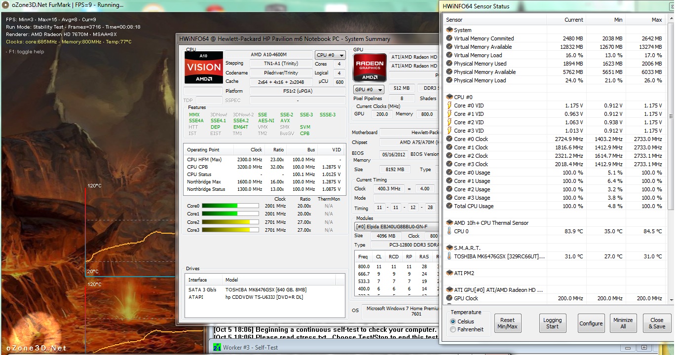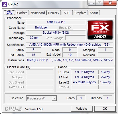 Die Basis unseres Testgeräts bildet das AMD A10-4600M. Der Quad-Core-Prozessor basiert auf der Trinity-Architektur und soll, dank der AMD Turbo-Core-3.0-Technologie, einen Takt von bis zu 3,2 GHz schaffen. Beim HP Pavilion m6-1050sg lag der maximale Takt während unseres Tests allerdings bei maximal 2,8 GHz. Der Basistakt vom schnellsten Ableger der A-Serie liegt bei 2,3 GHz. Die Thermal Design Power der in 32 Nanometer gefertigten Notebook-APU gibt der Chiphersteller mit 35 Watt an.