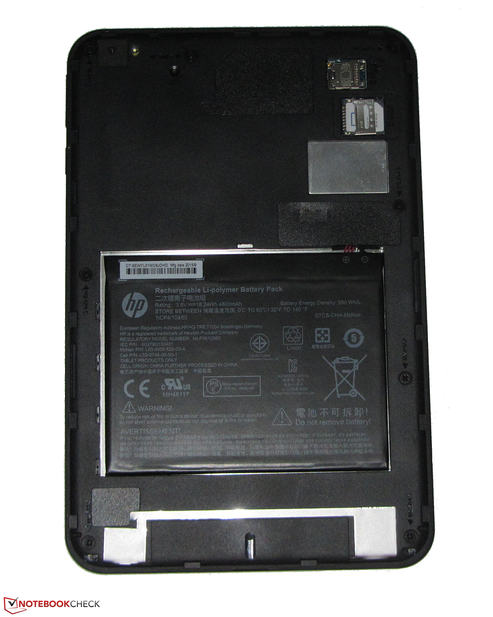 Das gesamte Gehäuse des Tablets besteht aus schwarzem Kunststoff. Verarbeitungsmängel zeigt das Gerät nicht. Allerdings dürfte es ein wenig steifer ausfallen. Es kann etwas zu leicht verdreht werden. Die Rückseite ist aufgesteckt, nicht verklebt oder verschraubt. Hinter ihr verbergen sich der MicroSD- und der SIM-Karten-Schlitz sowie der Akku. Das Tablet bringt die Schnittstellen mit, die wir von den meisten 8-Zoll-Tablets gewohnt sind. Eine MicroHDMI-Buchse erlaubt den Anschluss eines externen Monitors. Der MicroUSB-Steckplatz dient gleichzeitig als Anschluss für das Netzteil. Das Ladekabel fällt mit einer Länge von 1 Meter etwas zu kurz aus. Da HP hier aber auf eine USB-Lösung setzt, hat der Besitzer die Möglichkeit, ein längeres Kabel von einem anderen Hersteller zu nutzen.