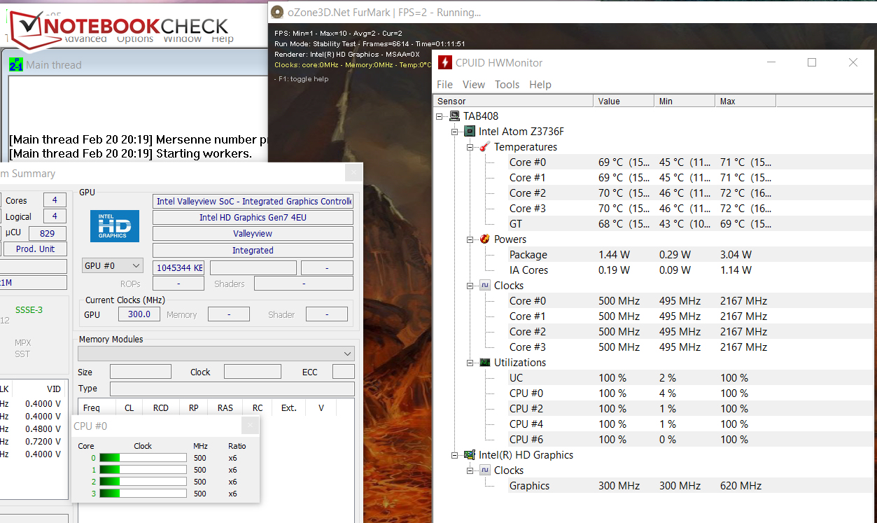In Inneren des Tablets findet sich Intels Atom Z3736F (Bay Trail) Vierkernprozessor. Es handelt sich hier um ein sparsames Modell, dessen TDP unter 4 Watt liegt. Somit kann der Prozessor passiv gekühlt werden. Die CPU arbeitet mit einer Basisgeschwindigkeit von 1,33 GHz. Per Turbo kann die Geschwindigkeit auf 2,16 GHz gesteigert werden. Die von uns durchgeführten CPU-Tests durchläuft der Prozessor mit 1,58 bis 2,16 GHz (Single-Thread) bzw. 1,58 GHz (Multi-Thread). Das Verhalten ist im Netz- und im Akkubetrieb identisch.
