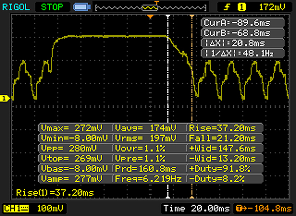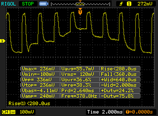 Das Display flackert mit 378 Hz (im schlimmsten Fall, eventuell durch Pulsweitenmodulation PWM) bei einer eingestellten Helligkeit von 40 % und darunter. Darüber sollte es zu keinem Flackern kommen. Die Frequenz von 378 Hz ist relativ hoch und sollte daher auch bei den meisten Personen zu keinen Problemen führen. Empfindliche User sollen laut Berichten aber sogar noch bei 500 Hz und darüber ein Flackern wahrnehmen. Im Vergleich: 53 % aller getesteten Geräte nutzten kein PWM um die Helligkeit zu reduzieren. Wenn PWM eingesetzt wurde, dann bei einer Frequenz von durchschnittlich 8111 (Minimum 5, Maximum 343500) Hz. | |||