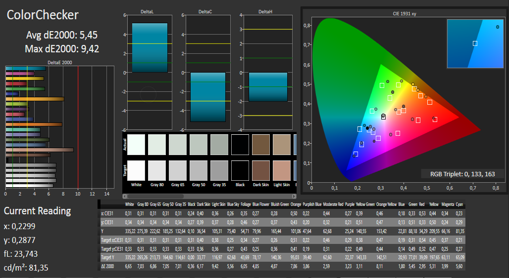 Im Auslieferungszustand zeigt das Display eine DeltaE-2000-Farbabweichung von 5,45. Der Zielbereich (DeltaE kleiner 3) liegt nicht allzu weit entfernt. Über einen Blaustich verfügt das Display nicht. Durch eine Kalibrierung des Bildschirms sollten sich die Werte verbessern.