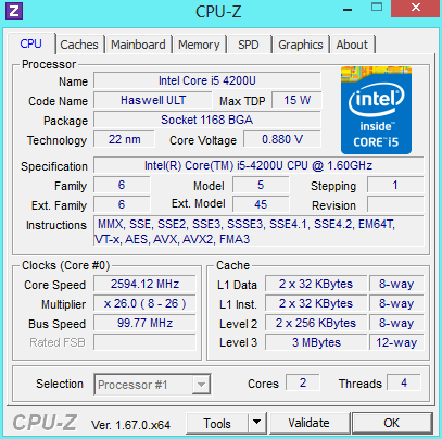 Als Prozessor wir der Intel Core i5 4200U eingesetzt. Dieser stammt aus der Haswell-Generation und vereint daher nicht nur die Grafikkarte, sondern auch den Chipsatz in sich. Der Dual-Core-Prozessor gehört zu den ULV-Prozessoren, den sehr sparsamen Recheneinheiten, die vor allen für Ultrabooks konzipiert wurden und hat eine TDP von 15 Watt.
