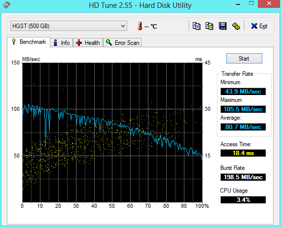 Als Massenspeicher wird eine Festplatte von Hitachi eingesetzt. Die Travelstar Z5K500 dreht mit einer Geschwindigkeit von 5.400 U/min und fasst 500 GB. Die Übertragungsraten sind unterer Durchschnitt und die Zugriffszeit von 18.4 ms ist im Vergleich zu SSDs sehr lang. Hier wäre sicherlich auch noch ein große Stellschraube für die Performance zu finden. Durch einen Tausch gegen eine aktuelle SSD sollte die Geschwindigkeit des Notebooks im Alltag stark steigen.