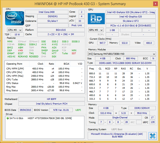 | HP ProBook 430 G3 P5T00ES 6200U, HD Graphics 520 | HP ProBook 430 G2 L3Q21EA 5200U, HD Graphics 5500 | HP ProBook 430-G1 4200U, HD Graphics 4400 | Dell Latitude 13 3340 Education Series 4200U, HD Graphics 4400 | Lenovo ThinkPad E450 20DDS01E00 5200U, Radeon R7 M260 | Dell Latitude 3450-9723 5200U, HD Graphics 5500 | Lenovo Thinkpad L450 20DS0001GE 5300U, HD Graphics 5500 | Fujitsu Lifebook E544 4210M, HD Graphics 4600 | |