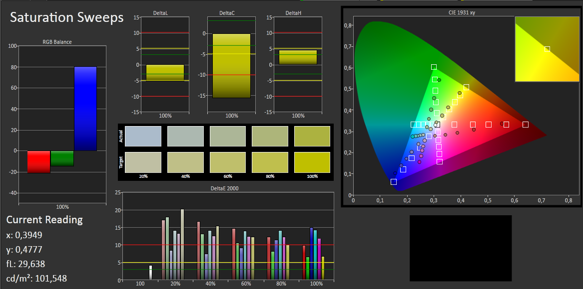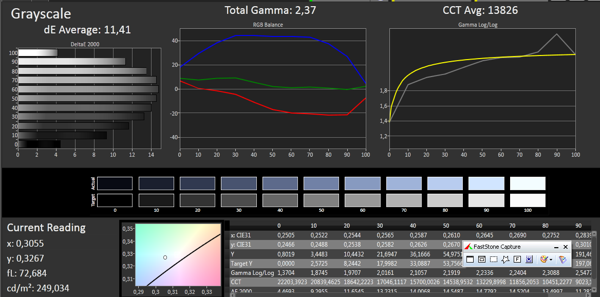 Die Farbanalyse zeigt eine deutliche Schwäche bei der Darstellung von Grautönen. Der DeltaE(2000) von 15 (Durchschnitt) besagt, Grautöne sehen nicht so aus, wie sie nach sRGB aussehen sollten. Gleiches gilt für die Farben Blau, Cyan und Magenta, sie haben einen krassen Blaustich (DeltaE >10). Mit 7.5172 K ist der Weißpunkt deutlich in den Blaubereich verschoben (zu kühl, ideal: 6.500 K).