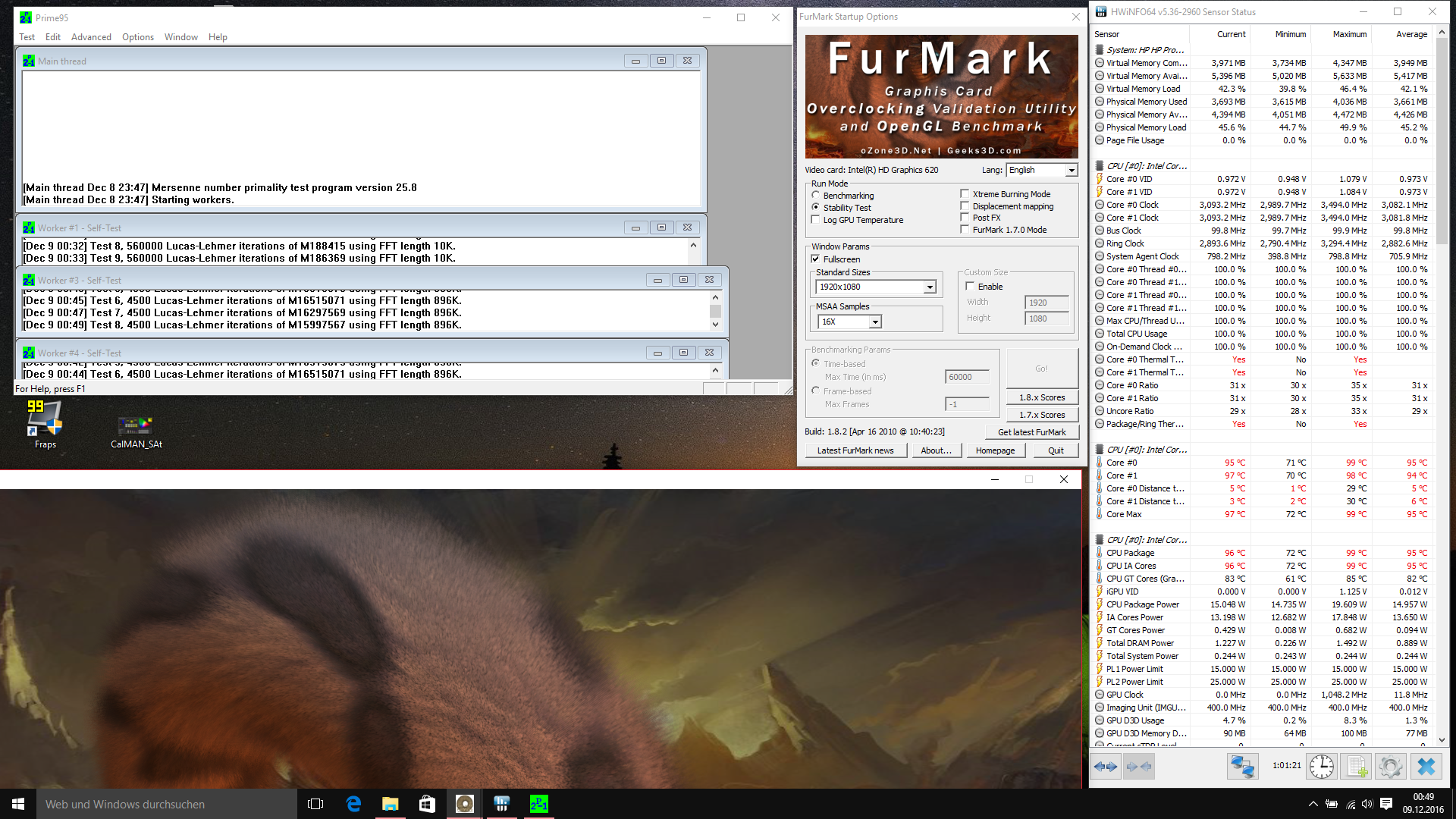 Für diesen Stresstest lassen wir FurMark und Prime95 für eine längere Zeit nebeneinander laufen. Dabei ist festzustellen, das HP jedwedes Throttling vermeiden kann: Zwar taktet die CPU von Anfang an mit ihrem Grundtakt von 3,1 GHz, dieser kann aber konstant gehalten werden und wird zu keinem Zeitpunkt unterschritten. Die Temperaturen an der CPU erreichen dabei maximal 99 °C, was sehr nahe an der Notabschaltung liegt. Hier hat sich HP für höhere Temperaturen entschieden statt für Throttling. Zu erwähnen ist, dass der Lüfter relativ leise arbeitet bei Last. Wenn dieser schneller laufen würde, dann könnte das System vermutlich kühler laufen. Ein direkt nach Ende des Stresstests durchgeführter Cinebench Test führte zu einem niedrigeren Ergebnis von 336 Punkten, da die CPU bei 3,1 GHz bleibt. Nachdem das System nach ein paar Minuten runtergekühlt ist, kann es in einem weiteren Cinebench Durchlauf am Anfang wieder ganz normal mit 3,4 GHz takten und erreicht mit 350 Punkten erneut etwa das normale Ergebnis.