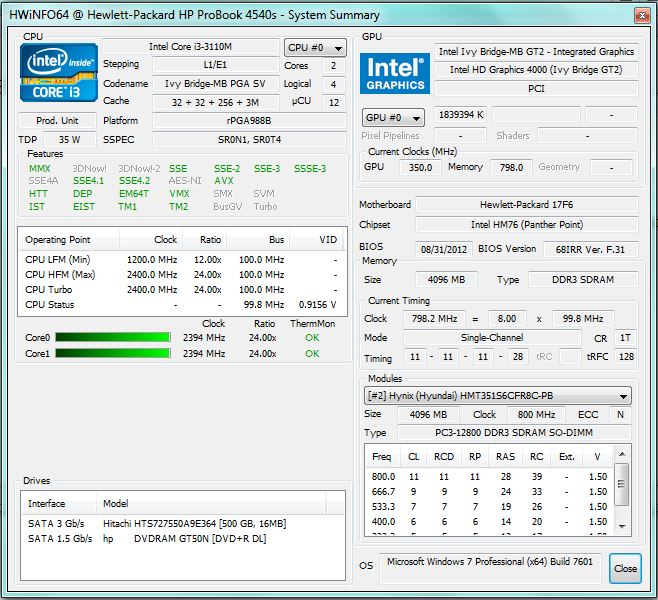 Das uns zur Verfügung gestellte ProBook wird von einem Intel Core i3-3110M Doppelkernprozessor angetrieben. HP hat sich damit für einen Abkömmling aus Intels Ivy-Bridge-Prozessorserie entschieden. Die CPU arbeitet mit einer Geschwindigkeit von 2,3 GHz. Einen Turbo gibt es nicht.