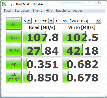 Hewlett Packard stattet das Probook mit einer Festplatte aus der Seagate-Momentus-Thin-Reihe aus. Sie besitzt eine Kapazität von 500 GB und arbeitet mit 5.400 Umdrehungen pro Minute. CrystalDiskMark meldet eine Lesegeschwindigkeit von 107,8 MB/s. HD Tune liefert eine durchschnittliche Transferrate von 89,4 MB/s. Hierbei handelt es sich um sehr gute Werte für eine 5.400er-Festplatte.