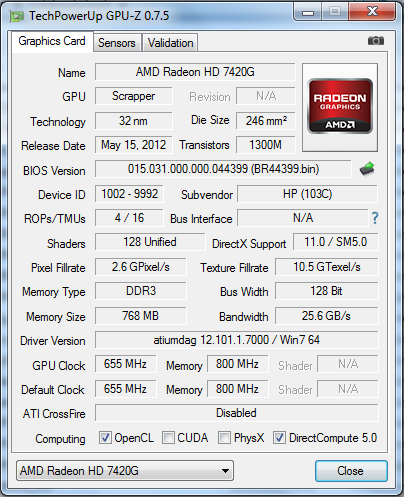 Für die Grafikausgabe ist der Radeon HD 7420G Grafikkern zuständig. Er unterstützt DirectX 11 und arbeitet mit einer Basisgeschwindigkeit von 480 MHz. Mittels Turbo kann die Geschwindigkeit auf 655 MHz gesteigert werden. In keinem der 3D Mark Benchmarks kann das Probook mit dem Thinkpad Edge (AMD A8-4500M, Radeon HD 7640G) mithalten, da Letzteres mit einer stärkeren GPU bestückt ist. Das Latitude (Core i5-4200U, Radeon HD 8850M) entscheidet natürlich dank seinem dedizierten Radeon Kern alle Benchmarks klar für sich. Auch eine Latitude Variante ohne dedizierte GPU würde besser abschneiden als das Probook. In diesem Fall würde der integrierte HD Graphics 4400 Kern arbeiten, der etwas leistungsstärker ist als der Radeon HD 7420G Grafikchip.