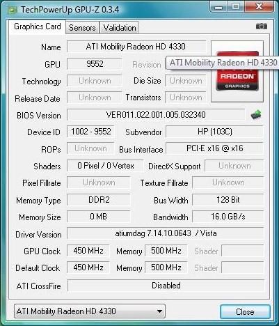 Für Grafikbelange zeichnet sich eine ATI Mobility Radeon HD4330 verantwortlich. Es handelt sich dabei um eine eigenständige Grafikkarte im Einstiegssegment, mit welcher wenig fordernde 3D-Aufgaben ganz gut erledigt werden können. Für 3D-intensive Aufgaben oder gar aktuelle Computerspiele gibt es aber bessere Lösungen. Die eingebaute HD 4330 nutzt nur DDR2 Speicher als Grafikspeicher, wodurch zugunsten des Preises im Vergleich zur GDDR3 Ausstattung auf etwas Grafikleistung verzichtet wurde. Für nähere Informationen steht ihnen bezüglich Grafikleistung unsere Spielebenchmarkliste aktueller Grafikkarten beziehungsweise unsere Mobile Grafikkarten -Benchmarkliste zur Verfügung.