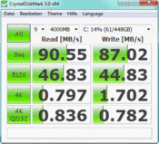 Die schnelle 7.200 RPM Festplatte von Seagate (ST9500420AS) mit ihren 500 GB Bruttokapazität macht sich als Leistungsträger des Systems bemerkbar. Die HDD liest mit 79 MByte/s im Sequential Read Daten von der Platte (HD-Tune). Der Crystal Disk Mark, der eine andere Testroutine nutzt, kommt sogar auf 90 MByte/s beim Schreiben. Dies führt in der Konsequenz zu einem, für eine rotierende Single-HDD sehr guten HDD-Score im PCMark Vantage von 4.169 Punkten. Typische 5.400 RPM HDDs liegen hier meist bei knapp über 3.000 Punkten.
