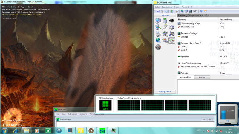 Das kleine ProBook 5330m muss mit dem Intel Core i5-2520M einen der High-End-Doppelkernprozessoren aus Intels aktueller Generation der Core-Prozessoren kühlen. Schon im Abschnitt Lautstärke haben wir bemerkt, dass das Notebook damit unter Last einiges zu tun hat.