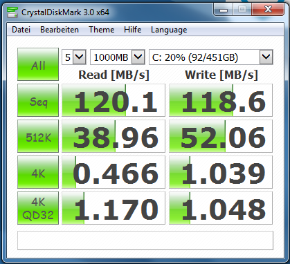 Der System Storage des PCMark 7 fällt etwas besser aus als bei den Konkurrenten (9 bis 20 %). Der CrystalDiskMark erklärt den Hintergrund: Die 7200-U/Min-Festplatte von Hitachi kann recht schnell verstreute Daten einlesen und ist beim sequentiellen Lesen und Schreiben sogar sehr gut. 120 MB/s sind ein selten erreichter Wert, freilich nur in Bezug auf konventionelle Festplatten.