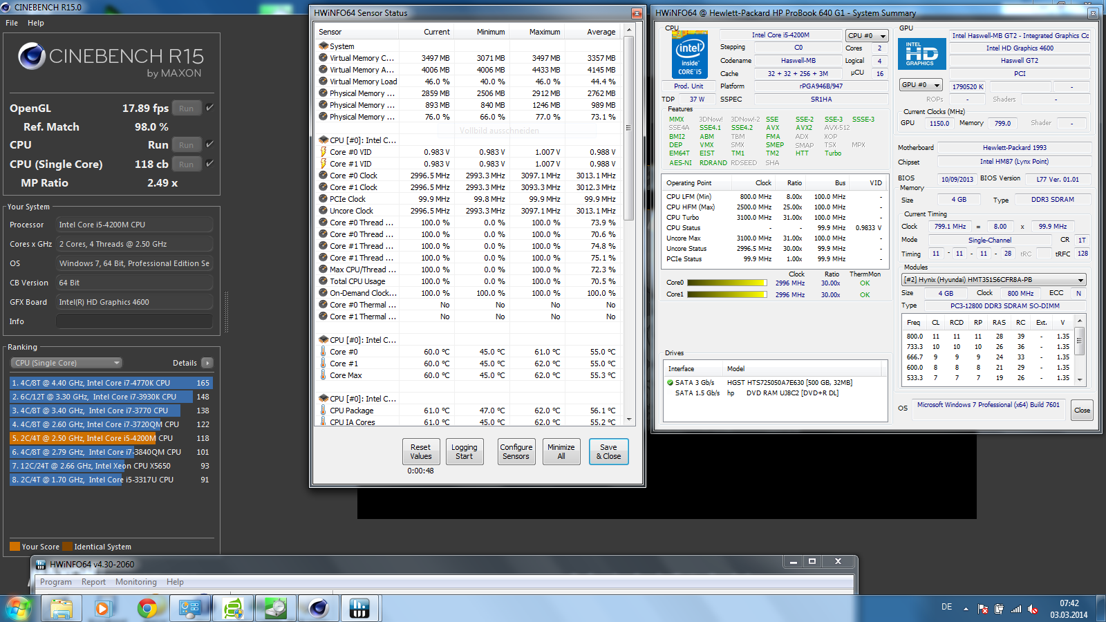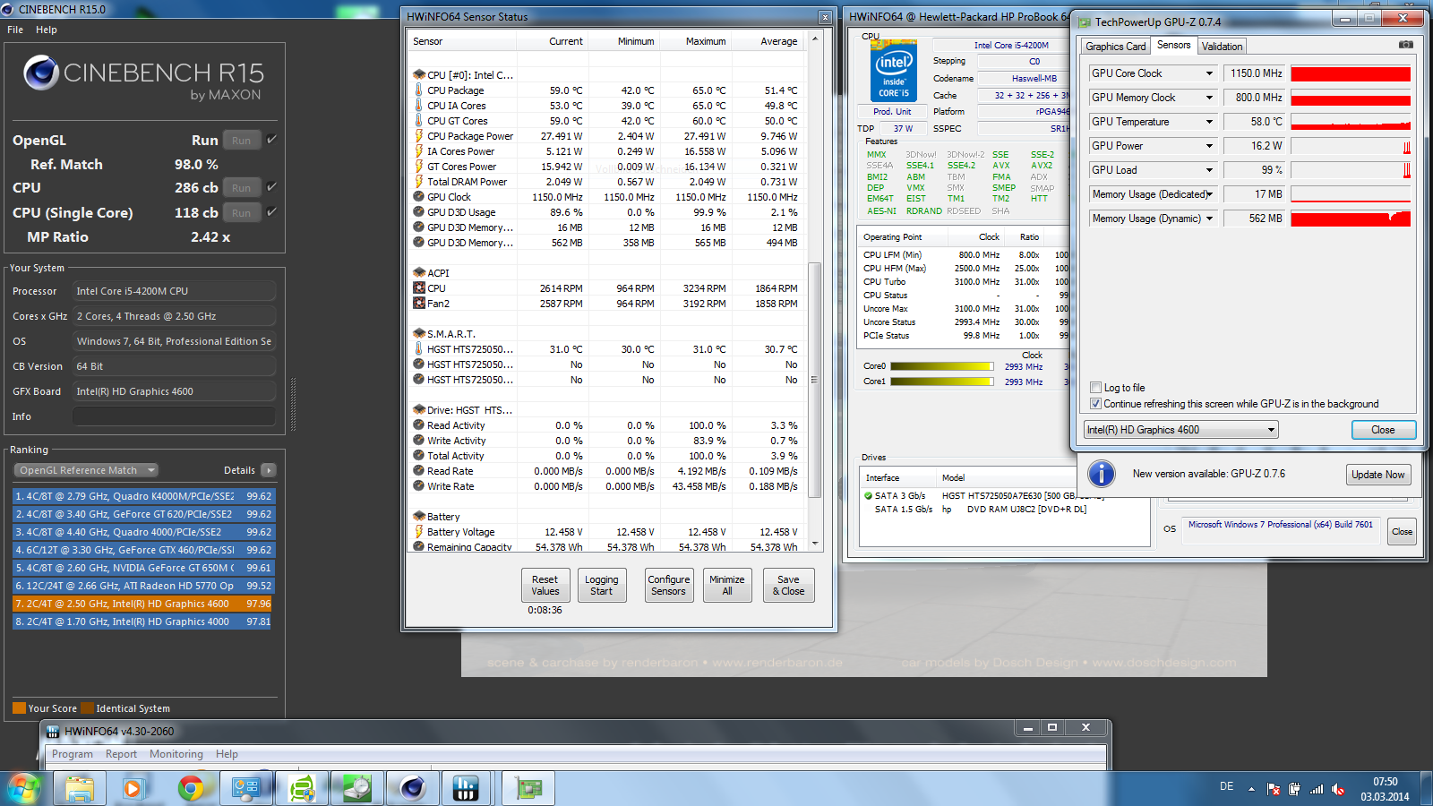 Der Core i5 4200M (37 Watt) hat eine Turbo-Range von 2,5 bis 3,1 GHz. Die nutzt die CPU auch tatkräftig aus, der Cinebench R15 Multi läuft konstant mit 3,0 GHz. Bei der Grafikkarte liegt ebenfalls der Takt an, den die Spezifikation vorgibt: 1.150 MHz. In Folge zeigt sich das ProBook unbeeindruckt von Ivy Bridge (Lifebook E743). Nur dem höher taktenden i5 4330M (2,8–3,5 GHz Turbo) kann es nicht das Wasser reichen. Die OpenGL Tests entscheidet unser Testgerät trotz Single-Channel-RAM mit einem hauchdünnen Vorsprung für sich. L440 und Lifebook E743 haben ebenfalls Single-Channel-Speicher an Bord. Dual Channel, aktiv bei zwei eingesetzten Speichermodulen, beschleunigen die GPU nach Messungen bei anderen Geräten um 15 bis 20 %.
