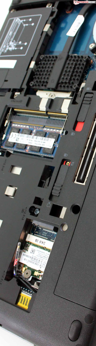 Einfacher geht es nicht: Schieber entriegeln und Bodenklappe abnehmen. Danach liegt das Innenleben frei. Der freie M.2-Edge-Steckplatz ist für ein 3G-Modem vorbereitet (Antennen, SimCard-Steckplatz). Die CPU ist gesteckt und der Lüfter kann gereinigt werden. Zuletzt gibt es da noch einen freien RAM-Slot.