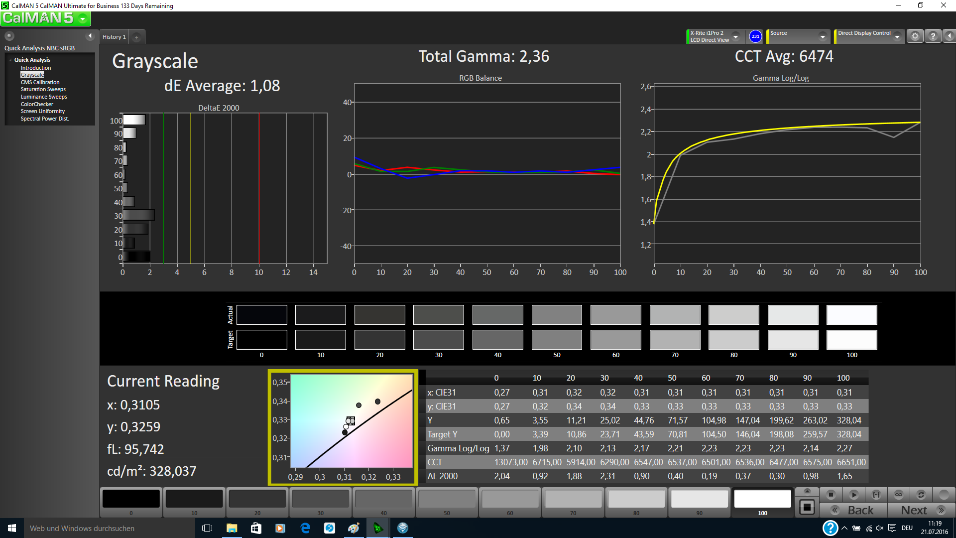 Blicken wir zunächst erst einmal auf die Farbwiedergabe des Displays: Im Auslieferungszustand zeigt das Panel einen drastischen Blaustich und dementsprechend hohe Delta-E-Abweichungen. Eine nachträgliche Kalibrierung verbessert die Darstellung enorm und drückt die mittleren Delta-E-Werte auf hervorragende 1,1 (Graustufen) beziehungsweise 1,7 (Farben). Leider deckt der verfügbare Farbraum nur knapp 75 Prozent des sRGB-Standards ab, was für die professionelle Foto- und Bildbearbeitung definitiv zu wenig ist.