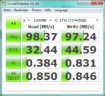 Die durchschnittliche Transferrate lag im Test bei 78,63 MB/s, gemessen mit HD-Tune. Mit CystalDiskMark 3.0 konnten wir der Platte noch etwas mehr entlocken. CystalDiskMark 3.0 ermittelte einen Wert von rund 98 MByte/s, wobei wir fünf Durchläufe durchführten. Die Burst-Rate lag im Test bei 104,3 MB/s bei einer CPU-Belastung von 3,9 Prozent. Eine Notebook-Festplatte mit 7.200 Umdrehungen könnte eigentlich sogar noch etwas mehr leisten.