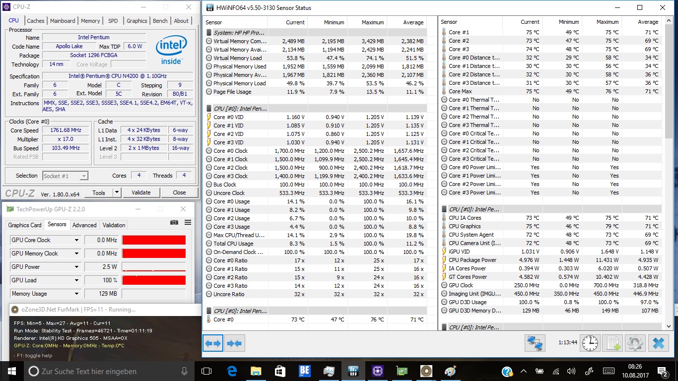 . Diese lassen wir für mindestens eine Stunde zeitgleich laufen und ermitteln so die maximale Temperatur des Prozessors unter Last. Mehr als 80 °C erreicht dieser auch nach anhaltender Belastung nicht. Mit einer Taktfrequenz von 1,2 GHz liegt er noch leicht über dem Basistakt von 1,1 GHz. Somit kann Throttling aufgrund anhaltender Dauerbelastung ausgeschlossen werden.