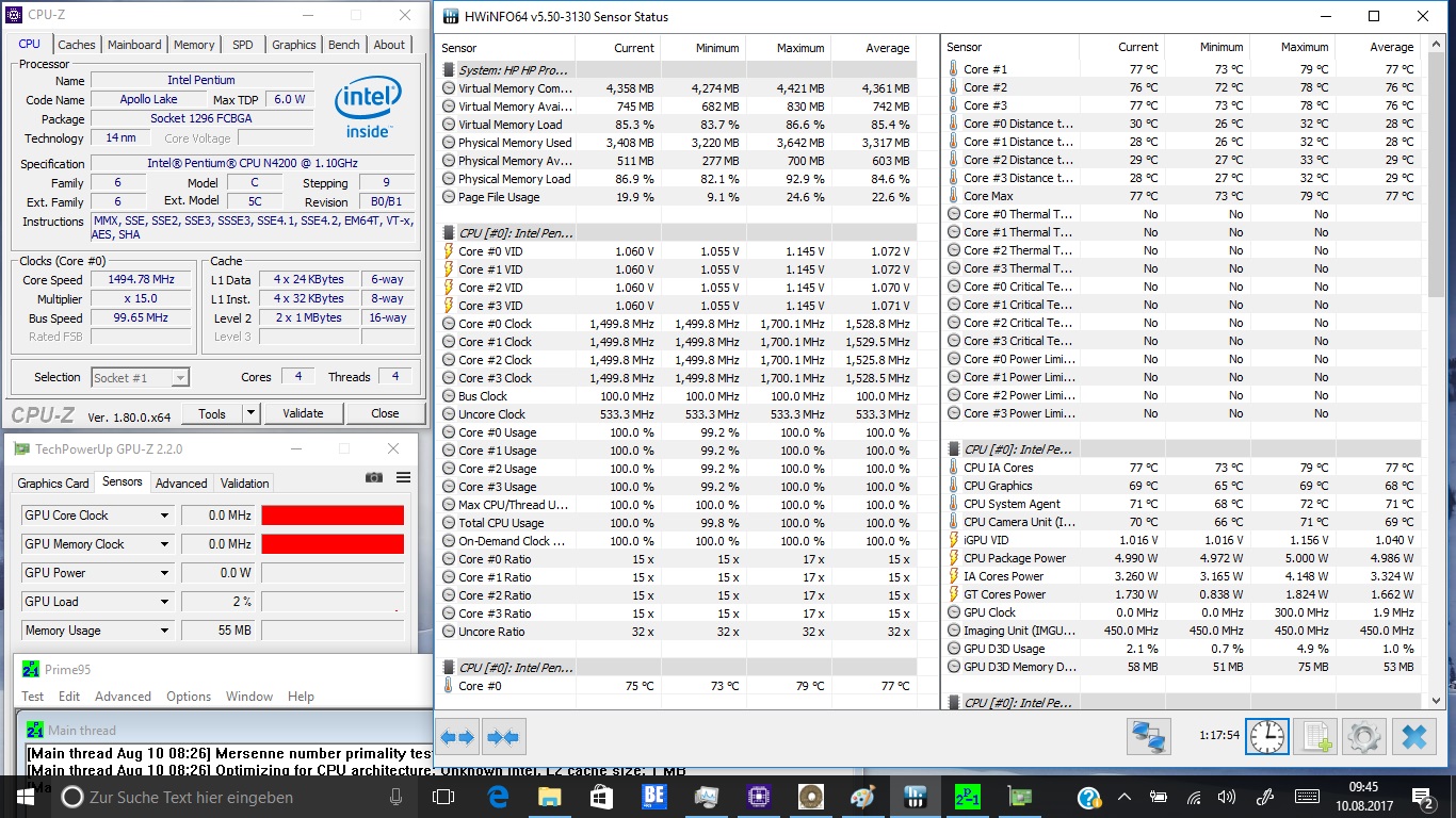 Als Prozessor dient eine Quadcore-CPU mit einem Basistakt von 1,1 GHz. Der Intel Pentium N4200 ist mit einer TDP von 6 Watt spezifiziert, und je nach Auslastung kann das kleine SoC mit bis zu 2,5 GHz arbeiten. Im Vergleich zu den ähnlich ausgestatteten Geräten, welche als Basis die gleiche CPU benutzen, reiht sich das HP ProBook X360 11 mit ein. Die Haupteinsatzzwecke wie Office-Arbeiten und das Surfen im Internet meistert der kleine, sparsame Prozessor bestens.