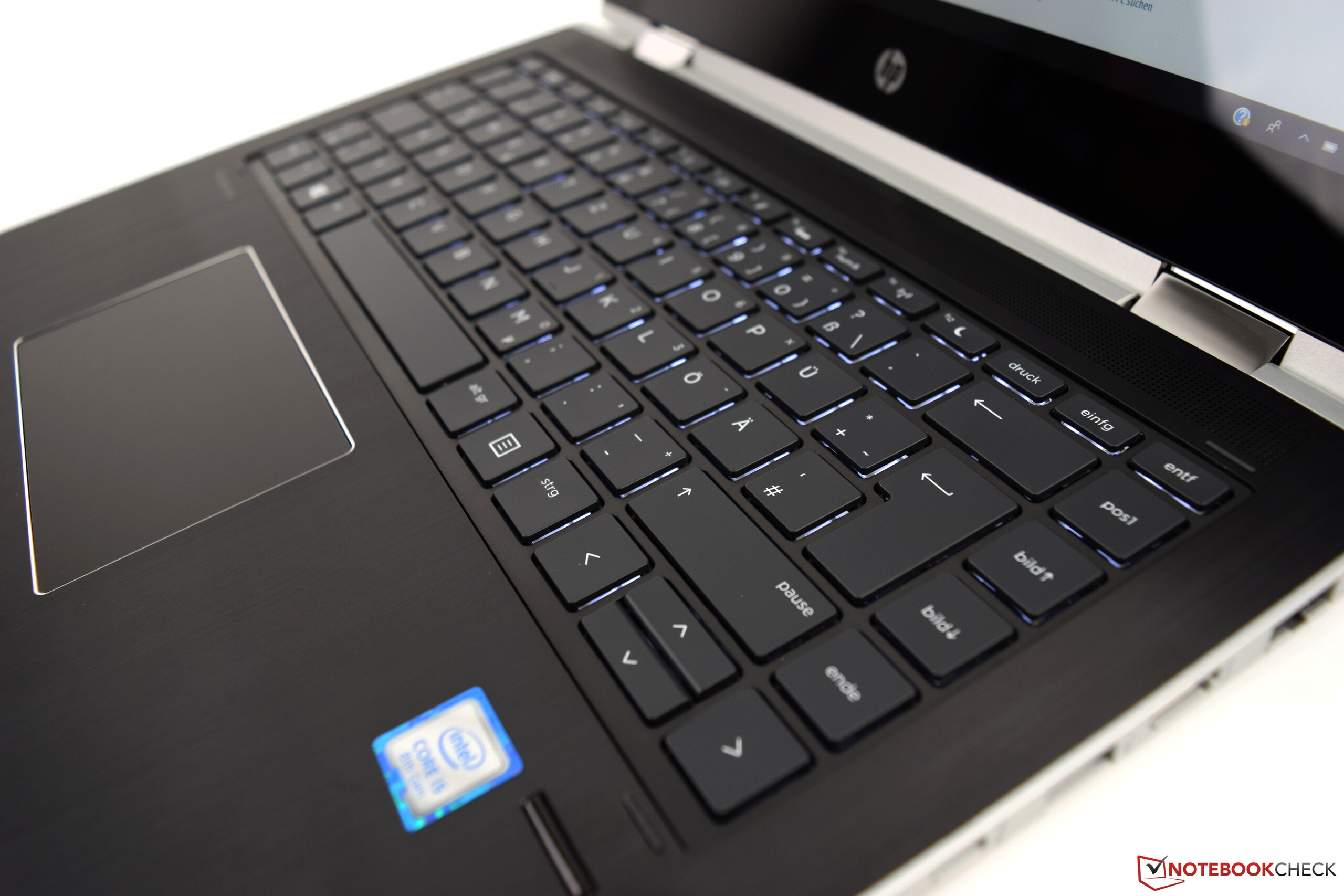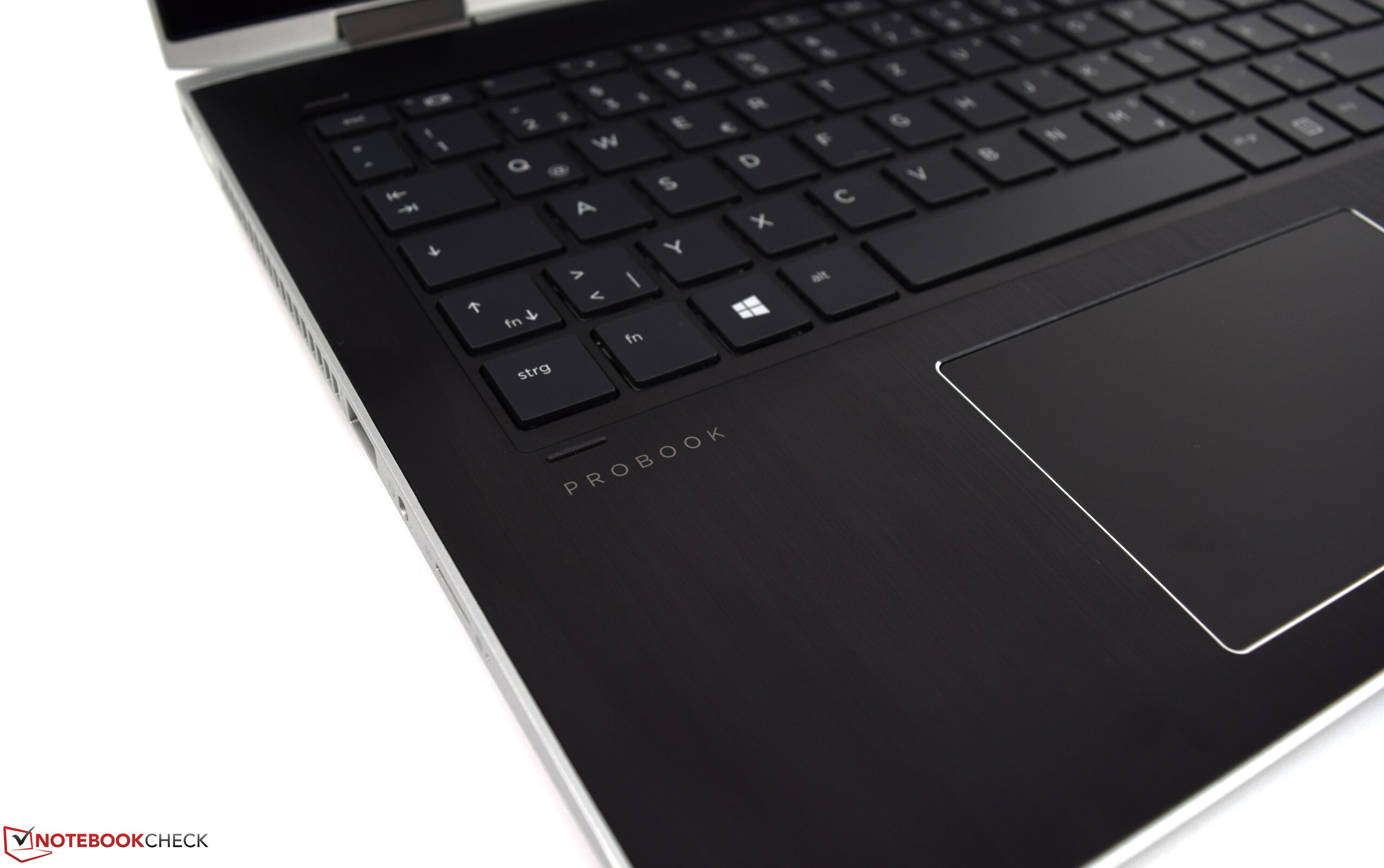 HP stattet das ProBook x360 440 G1 mit seiner HP-Premium-Tastatur aus. Diese Chiclet-Tastatur ist spritzwassergeschützt und mit einer zweistufigen Hintergrundbeleuchtung versehen (optional). Die unstrukturierten, matten Tasten sind mit 16 x 15 Millimetern ausreichend groß. Die Pfeiltasten (hoch/runter) sind zwar deutlich breiter, aber nur halb so hoch wie die restlichen Tasten, was zum Anfang etwas Eingewöhnung bedarf. Insgesamt ist die Tastatur in die Base eingelassen, sodass die Tasten in einer Flucht mit der Handballenauflage liegen. Dies ist insofern wichtig, da das Gerät im Präsentationsmodus auf der Tastatur steht.