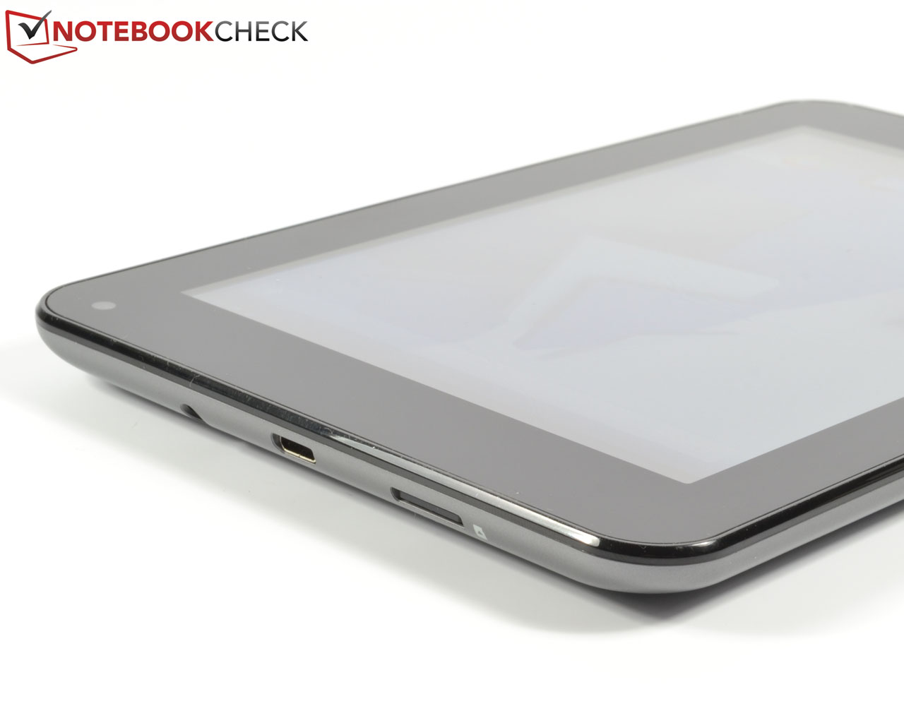 Die Anschlüsse fallen genre-üblich sehr mau aus. Immerhin: Neben der Standard-USB-2.0-Schnittstelle kann der interne Speicher via microSD-Slot (bis zu 32 GB) kostengünstig und schnell erweitert werden. Beide Ports befinden sich ebenso wie die obligatorische 3,5-mm-Klinkenbuchse gut erreichbar an der Stirnkante des Tablets.