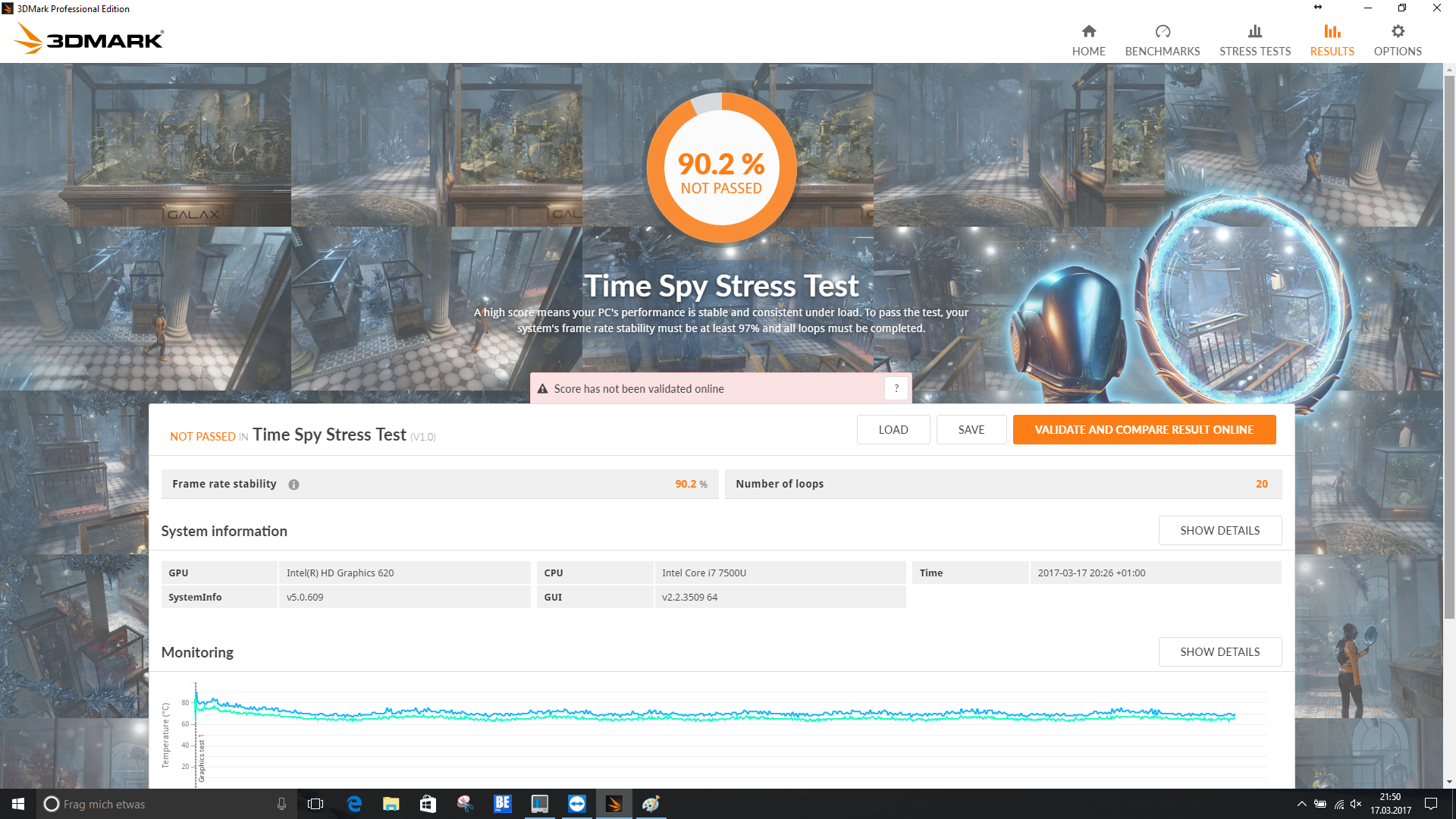 Unter Dauerbelastung müssen nun auch die verbauten Komponenten zeigen, ob das Kühlsystem ausreichend dimensioniert ist. Der Prozessor erwärmt sich unter Belastung mit Prime95 auf maximal 83 °C. Die durchschnittliche Taktfrequenz lag bei 2,1 GHz. Zum Thermal Throttling kam es nicht, da das Power Target schon vorher einsetzte. Unter Belastung der Intel HD Graphics 620 mit Furmark erzielten wir maximal 72 °C. Die Taktfrequenz der Grafikeinheit schwankte zwischen 950-1.000 MHz.