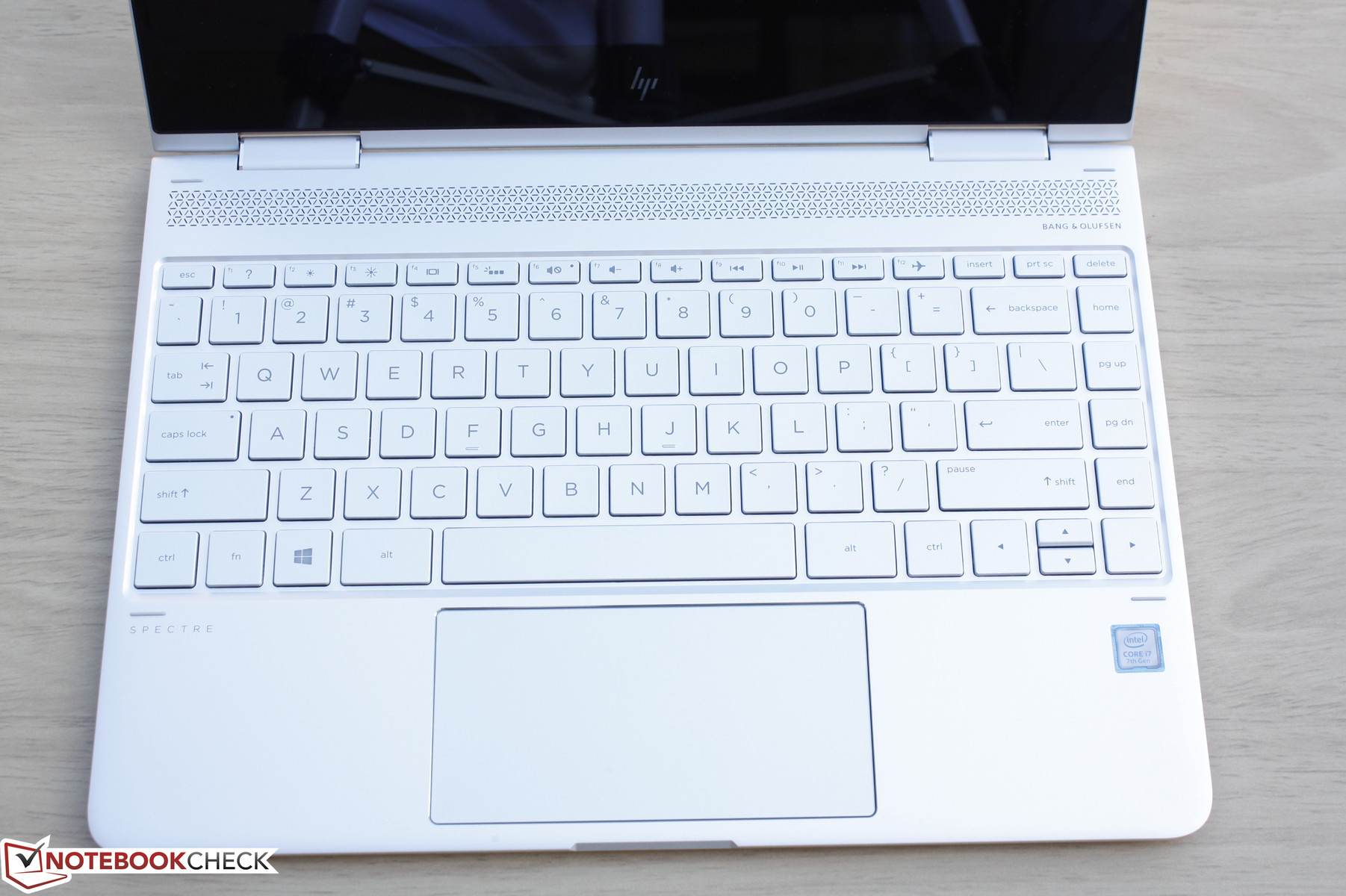 Die Tasten weisen einen relativ seichten Hubweg von 1,3 mm auf. Das Feedback ist eher weich und hätte verglichen mit dem, was die Lenovo-AccuType- und die Dell-XPS-13-Serie bieten, etwas fester sein können. Die Leertaste und die Auf-/Ab-Pfeiltasten sind beim Spectre besonders weich. Andererseits ist die Tastatur für ein 13-Zoll-Notebook ziemlich geräumig (~29 x 10 cm), da das Design mit schmäleren Rahmen keinen Einfluss auf die Tastengröße hatte.