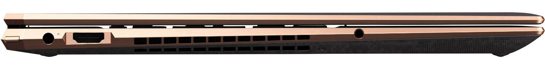 Wie die Gehäuse der Vorgänger ist auch das Gehäuse des aktuellen Spectre-Modells aus Metall gefertigt. Die schmalen Seiten des Chassis sind in einer Art Gold-Kupfer-Ton gefärbt. Ober- und Unterseite der Baseunit und die Deckelrückseite sind in einem dunklen Grauton (Dark Ash Silver) gehalten. Die auffälligste Änderung gegenüber den Vorgängern stellt die Gehäuseform dar. Die schmalen Seiten des Gehäuses laufen keilförmig zu. Die hinteren Ecken des Rechners sind abgekantet. An diesen Stellen verbaut HP den Einschaltknopf bzw. einen Thunderbolt-3-Steckplatz. Auch dieses Spectre-Modell hat keine Wartungsklappe vorzuweisen.