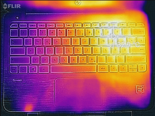 (+) Die Handballen und der Touchpad-Bereich sind mit gemessenen 29.6 °C kühler als die typische Hauttemperatur und fühlen sich dadurch kühl an.