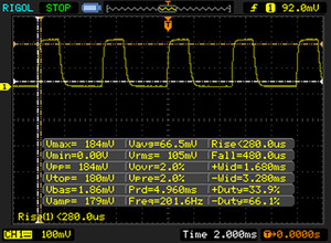 Das Display flackert mit 201 Hz (im schlimmsten Fall, eventuell durch Pulsweitenmodulation PWM) bei einer eingestellten Helligkeit von 30 % und darunter. Darüber sollte es zu keinem Flackern kommen. Die Frequenz von 201 Hz ist relativ gering und daher sollte es bei sensiblen Personen zu Problemen wie Flackern oder Augenbeschwerden führen. Im Vergleich: 53 % aller getesteten Geräte nutzten kein PWM um die Helligkeit zu reduzieren. Wenn PWM eingesetzt wurde, dann bei einer Frequenz von durchschnittlich 8142 (Minimum 5, Maximum 343500) Hz. | |||