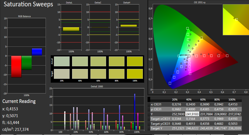 Genauere Einsichten in die Farbdarstellung liefert uns die Analyse mit dem Spektralfotometer und der Software CalMan. Bei den Graustufen zeigt sich hier ein deutlicher Grünstich gegenüber den Farbtönen im Referenzfarbraum sRGB. Helle Grautöne sind von den Farbabweichungen am stärksten betroffen. Bei den Farben werden vor allem Blautöne und Hellbraun unzureichend genau dargestellt, generell werden aber alle Farben zu grün auf dem Bildschirm ausgegeben. Die durchschnittliche Farbabweichung ist sowohl bei den Grautönen als auch bei den Farben die höchste im Vergleichsfeld.