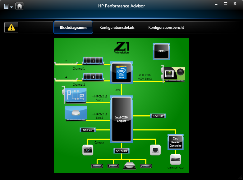 Die Ausstattung der HP Z1 Workstation bietet einige Besonderheiten. Neben den üblichen Anschlüssen für externe Peripheriegeräte wie USB 2.0, USB 3.0 und DisplayPort 1.1 bietet die Workstation vor allem für die interne Erweiterbarkeit willkommene Optionen. Ein MXM-Steckplatz ermöglicht das flexible Erweitern oder Austauschen der dedizierten Grafikeinheit. In HPs Produktspezifikationen wird als leistungsstärkstes Modul Nvidias Quadro K4100M genannt. Zwei mSATA-Steckplätze in voller Baugröße ermöglichen den Einsatz schneller mSATA-SSDs. Diese sind zwar nicht so performant wie aktuelle PCIe-Modelle, sollten für die meisten Szenarien aber immer noch genügend Geschwindigkeit bieten. Zudem besteht die Möglichkeit entweder ein großes 3,5-Zoll-Laufwerk oder zwei 2,5-Zoll-Laufwerke mit Hilfe der Laufwerkseinschübe zu verbauen. Ein optisches Laufwerk, ein SD-Kartenleser und 4 RAM-Steckplätze komplettieren die Schnittstellensektion. Thunderbolt 2.0 ist bei Bedarf durch eine Steckkarte nachrüstbar. Auf die Audio-Ausstattung gehen wir im Kapitel Emissionen gesondert ein.
