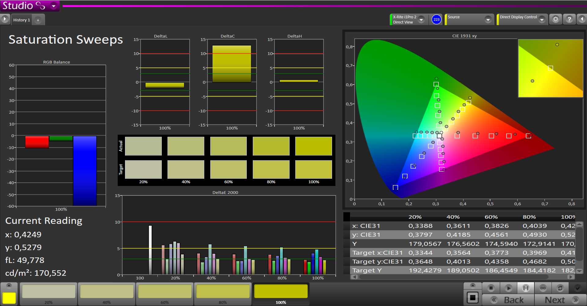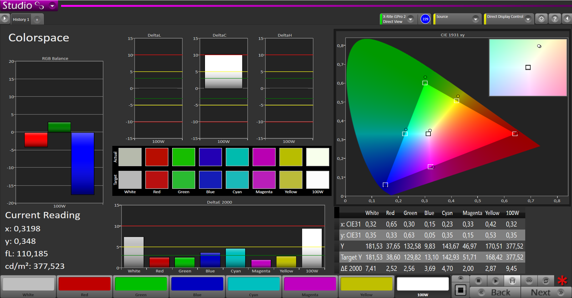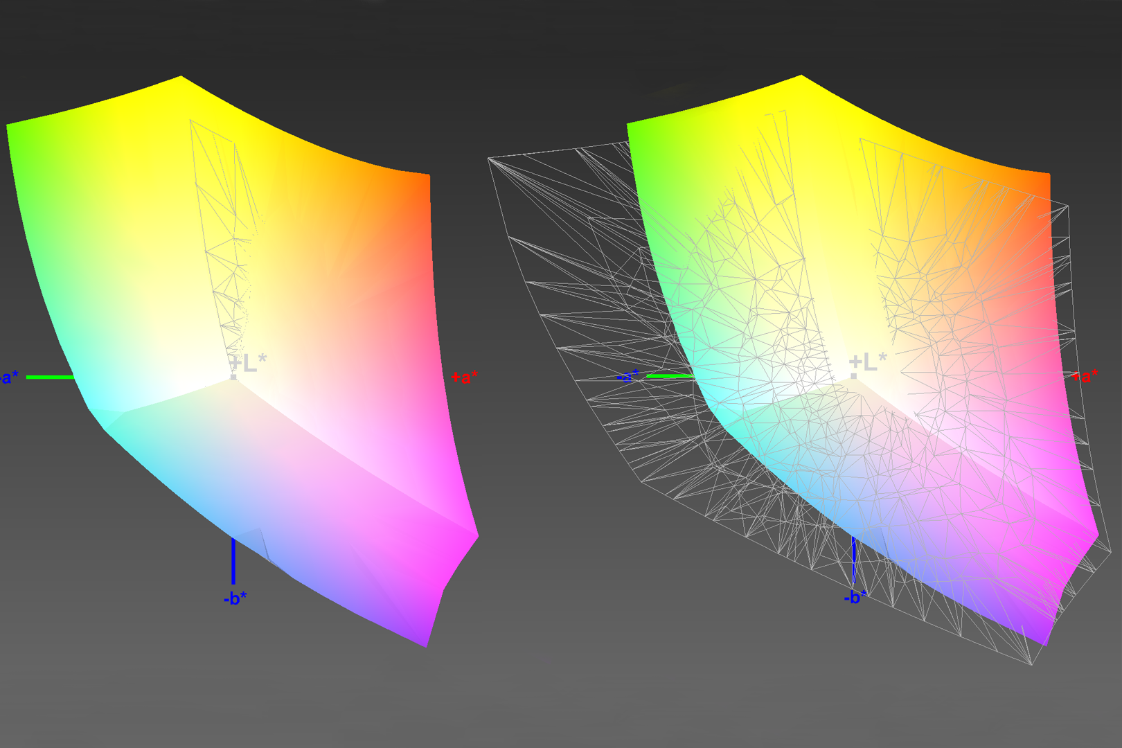 Hinsichtlich der Farbgenauigkeit ist unser Testgerät im Auslieferungszustand offensichtlich nicht optimiert worden. Zwar fallen die Ergebnisse deutlich besser aus, als bei den meisten Notebookdisplays, an ein halbwegs farbtreues Arbeiten ist aber auch hier "out-of-the-box" nicht möglich. Mit DeltaE 2000-Werten von bis zu 9,68 bei den Graustufen ist an ein genaues Arbeiten zunächst nicht zu denken. Nach der obligatorischen Profilierung des Displays kann man aber auf eine nahezu perfekte Farbdarstellung bauen, die mit DeltaE 2000-Werten von maximal 1,57 nur geringe Abweichungen zu den jeweiligen Referenzwerten aufweist. Ebenfalls vorbildlich zeigen sich die Sättigung, die RGB-Balance und die Gammakurve.