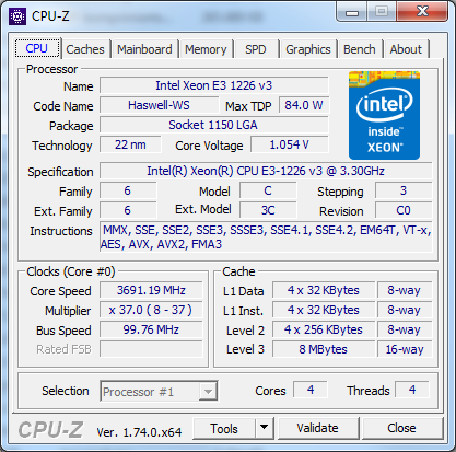 Intels Xeon E3-1226v3 ist eine leistungsstarke Desktop-CPU, die mit einer Thermal Design Power von 84 Watt deutlich über dem liegt, was Notebookprozessoren normalerweise benötigen. Mit einem recht hohen Basistakt von 3,3 GHz und einer möglichen Turboleistung von 3,7 GHz verfügt dieser Prozessor über gute Basiseigenschaften. Leider ist der Vierkerner nicht mit Intels Hyperthreading-Technologie bedacht worden, was die maximale Thread-Anzahl auf 4 beschränkt.