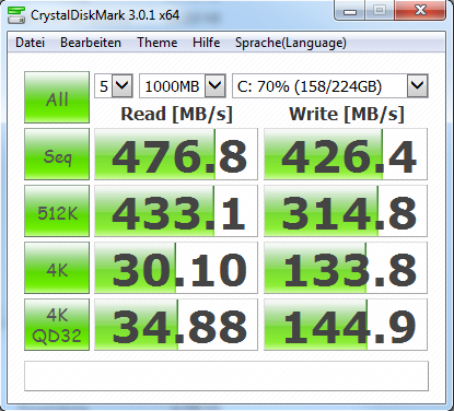 Als Massenspeicher kommt im Testsystem eine Micron M600 mSata SSD zum Einsatz. Sie verfügt über 256 GB Bruttokapazität, wovon etwa 15 GB für die Recovery-Partition abzuziehen sind. Die Testwerte bewegen sich im üblichen Rahmen von SATA-SSDs und reizen mit maximal 476 MB/s bei den Übertragungsraten schon recht gut das Maximum der Schnittstelle aus. Wie bereits angesprochen, kann die Massenspeicherkapazität durch ein weiteres mSATA-Laufwerk und zwei 2,5-Zoll-Laufwerke (alternativ eine 3,5-Zoll-Festplatte) ergänzt werden. RAID-Verbünde sind ebenfalls möglich und im BIOS bereits vorkonfiguriert. Extern lassen sich in jedem Fall USB 3.0 Laufwerke betreiben und optional ist auch die Anbindung von Thunderbolt-Geräten möglich.