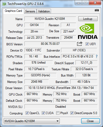 Beim Einsatz von DirectX-Software kommt es vor allem auf die reine Hardwareleistung an. Hier bewegt sich Nvidias Quadro K2100M in etwa auf dem Niveau einer Nvidia Geforce GT 750M. Beim 3DMark 2013 Firestrike werden beispielsweise 1.843 Punkte in der GPU-Wertung erzielt.