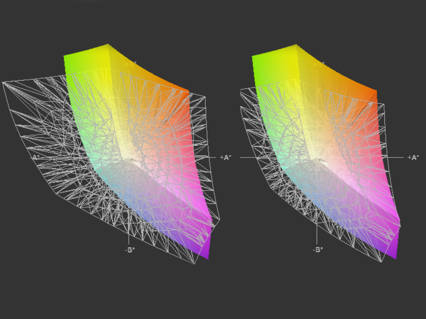 Der gemessene Kontrast von 525:1 ist zwar kein Spitzenwert, hebt sich aber eindeutig von den üblichen Standarddisplays ab und sorgt auch subjektiv für deutlich sattere Farben und ein recht brauchbares Schwarz. Filme, Fotos und 3D-Darstellungen gewinnen an Tiefe und werden sichtbar lebendiger wiedergegeben. Der vom Display unterstützte Farbraum kommt von der Gesamtsumme der darstellbaren Farben (ca. 841000) sehr nahe an den Umfang des sRGB-Farbraums (ca. 899000) heran. Da hier aber recht große Teile, z. B. im Grün-Gelb-Bereich, weit außerhalb der Schnittmenge liegen, reduziert sich die tatsächliche sRGB-Abdeckung auf etwa 80 %.