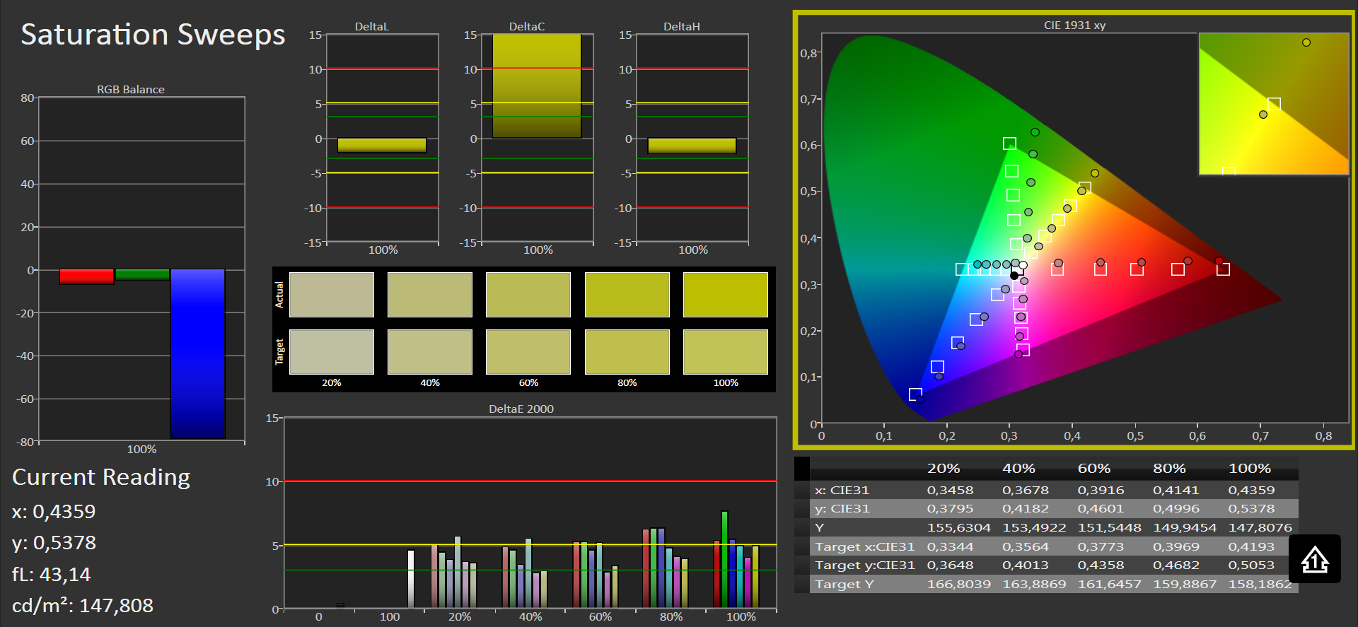 Die werkseitige Abstimmung des Bildschirms ist im Auslieferungszustand für die angestammte Zielgruppe wenig brauchbar. Die Abweichungen zum Ideal sind relativ hoch und lassen ein farbverbindliches Arbeiten nicht zu. Deutlich besser fallen die Ergebnisse nach einer Kalibrierung aus. Die Graustufenauflösung, die Gammakurve und die RGB-Balance sind dann fast perfekt. Nicht ganz so gut fallen die Sättigungswerte bei 100 % und die Farbgenauigkeit bei den Grundfarben aus. Da hier ein Teil des Farbraums nicht abgebildet werden kann, liegen die DeltaE-2000-Werte bei Cyan und Grün über der Grenze von 3. Bei den Mischfarben sieht das Ganze mit einem durchschnittlichen DeltaE 2000 von 0,6 zwar besser aus, aber auch hier fällt Cyan mit einem DeltaE 2000 von 3,81 deutlich aus dem Rahmen.