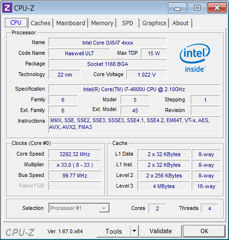 Die Ultra-Low-Voltage-CPU Intel Core i7-4600U ist speziell für flache und ausdauernde Notebooks konzipiert. Mit einer Thermal Design Power von 15 Watt (inklusive Speichercontroller und Intel HD Graphics 4400) handelt es sich hier um eine auf Sparsamkeit getrimmte Lösung, die hinsichtlich der reinen Rechenpower deutlich hinter den sonst in einer mobilen Workstation verbauten Standard-CPUs zurückbleibt. Dennoch reicht die Leistungsfähigkeit für viele Einsatzszenarien gut aus und kann sich dank den Technologien Intel Turbo Boost (Erhöhung der Taktrate auf bis zu 3.300 MHz) und Hyperthreading (maximal vier parallele Rechenoperationen/Threads) den jeweiligen Software-Anforderungen gut anpassen.