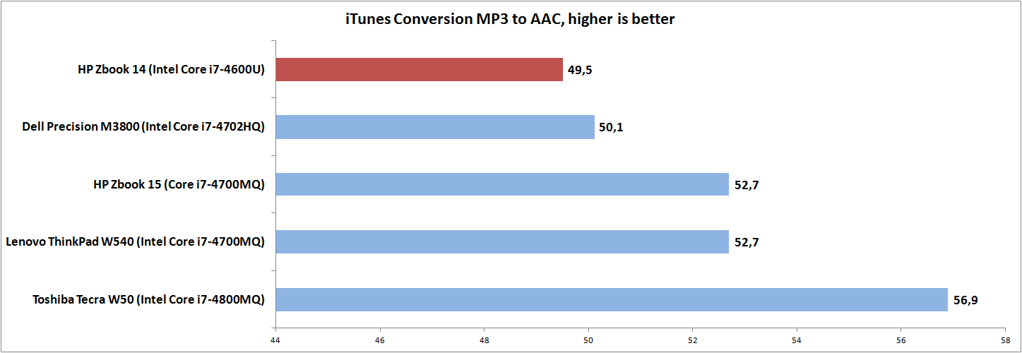 Einen weiteren Anhalt, wie die Leistungsfähigkeit der Intel Core i7-4600U einzuordnen ist, finden wir in unseren Praxistests. Beim Umwandeln von MP3-Files ins AAC-Format per iTunes (Single-Core) profitiert der Stromsparprozessor von seiner hohen Taktrate und schafft eine bis zu 49,5-fache Geschwindigkeit. Der Abstand zu den nominal leistungsstärkeren Konkurrenten fällt hier wieder vergleichsweise gering aus. Deutlich größer wird der Unterschied, wenn wie bei Cyberlinks MediaEspresso eine gute Multicore-Unterstützung vorliegt. Hier braucht unser Testprozessor teils mehr als das Doppelte an Zeit, bis man ein Ergebnis begutachten kann.