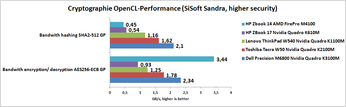 Wir haben verschiedene OpenCL-Operationen getestet, die die Bereiche Finanzmathematik, Kryptografie, Raytracing und Bildbearbeitung einschließen. Zudem testen wir auch schon seit längerem neben der CPU Intels Quick Sync Video bei der Videokonvertierung. AMDs APP (Accelerated Parallel Processing) konnte bei Cyberlinks MediaEspresso nicht genutzt werden. Die Ergebnisse der Videokonvertierung haben wir im Kapitel Prozessor dargestellt. Bei den Bildbearbeitungstests, der Finanzmathematik und der Verschlüsselung/ Entschlüsselung mit doppelter Genauigkeit macht AMDs FirePro M4100 eine gute Figur und kann den leistungsstarken Quadros je nach Sequenz ordentlich Paroli bieten, wenn nicht sogar davonrennen. Beim Raytracing per Luxmark vermag es von der Vergleichsgruppe nur die Nvidia Quadro K3100M, bei der Room-Szene unser Testmodell zu schlagen.