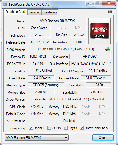 Die Hardware der AMD FirePro M5100 scheint von den Daten her sehr nah an der AMD Radeon R9 M270 angelehnt zu sein. Der Cape Verde Chip unseres Testmodells wird als R9 M270X angezeigt. Er verfügt über 2 GB GDDR5 Grafikspeicher, einen 128 bit breiten Speicherbus, 640 Shadereinheiten und taktet mit bis zu 775 MHz. Durch ein spezielles Bios und optimierte Treiber wird der professionelle Ableger des Consumerchips jedoch mit besonderen Fertigkeiten ausgestattet. Insbesondere bei OpenGL optimierten Anwendungen kommt so eine spürbare Leistungssteigerung zustande. Zudem sollen die FirePros gegenüber den Radeons besonders zuverlässig mit zertifizierter Software zusammenarbeiten, was im Arbeitseinsatz einen nicht zu unterschätzenden Vorteil bringt. Theoretisch kann die AMD FirePro M5100 bis zu insgesamt 5 Displays ansteuern. AMD nennt diese Technologie Eyefinity. Dadurch wird dem Anwender eine besonders große Arbeitsfläche zur Verfügung gestellt und erhöht in vielen Arbeitsbereichen die Produktivität. Das funktioniert allerdings in der Praxis direkt am HP ZBook 15 G2 mangels Schnittstellen nicht vollständig (maximal 3), sondern erfordert eine entsprechende Dockinglösung. Getestet haben wir dieses Feature nicht.