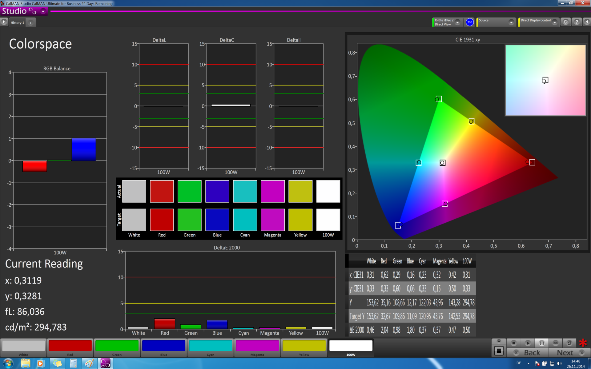 Die weiteren Messwerte liefern bereits im Auslieferungszustand ein gutes Ergebnis ab. Rein subjektiv ist die Darstellung ausgewogen und damit für eine Fülle von Aufgaben geeignet. Im bildverarbeitenden Bereich wird man jedoch obligatorisch eine Kalibrierung vornehmen. Erst dann zeigt das Panel sein feingetuntes Potential, das eine sehr genau Farbwiedergabe verspricht. Die Graustufenauflösung erreicht ein DeltaE 2000 von hervorragenden 0,37, die RGB-Balance weist kaum Unregelmäßigkeiten auf und die Gammakurve verläuft nahezu perfekt. Bei den Grundfarben liegen nach der Kalibrierung alle Ergebnisse deutlich unter einem DeltaE 2000 von 3. Blau und Rot weisen mit einem DeltaE 2000 von 2,04 und 1,80 noch die größten Abweichungen auf, liegen aber weit unter dem für das menschliche Auge sichtbaren Grenzwert. Wenn die Grundfarben passen, dann kann auch bei den Mischfarben nichts mehr schief gehen, hier fällt das durchschnittliche DeltaE 2000 mit 0,55 ebenfalls rekordverdächtig gering aus. Bleibt der Vollständigkeit halber noch zu erwähnen, dass alle Sättigungswerte in die vorgesehenen Zielkorridore fallen und keine Auffälligkeiten hervorbringen.