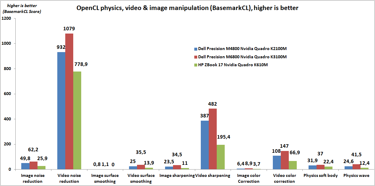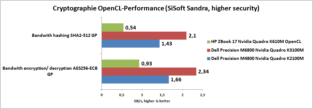 Ebenfalls keine Lorbeeren erntet die Quadro K610M, wenn es darum geht, Aufgaben per OpenCL oder CUDA durch die Grafikeinheit bewältigen zu lassen. Beim Luxmark Raytracing-Benchmark wird sie sogar von Intels HD Graphics 4400 aus dem Dell Latitude E7240 überfügelt. Ebenfalls keine Chance hat Nvidias eigene CUDA-Engine im Vergleich zu Intels Quick Sync Video, wenn Videokonvertierungen durchgeführt werden. Bei weiteren OpenCL-Tests aus den Bereichen Finanzmathematik, Kryptographie, Video- und Fotofilter fehlen noch Vergleichswerte außerhalb der Quadro-Riege. Im internen Vergleich ordnet sich die Quadro K610M wie erwartet am unteren Ende der Leistungsskala ein.