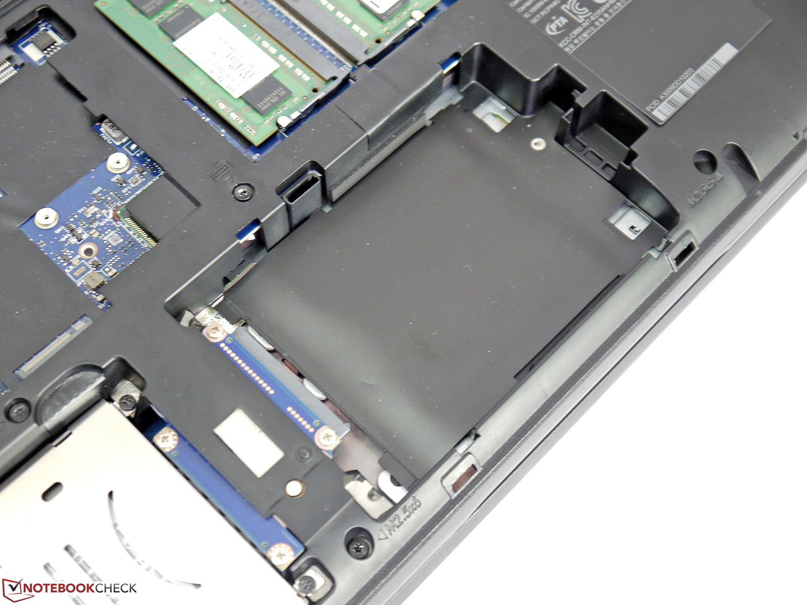 Die Bodenplatte lässt sich vorbildlich einfach öffnen. Zwei Schieber werden nach Außen gedrückt und schon kann man die Abdeckung entfernen. Darunter befinden sich die wesentlichen Komponenten und Steckplätze. Zwei weitere RAM-Slots befinden sich unter der Tastatur und sind beim Testmodell bereits mit 2 x 4-GB-Modulen belegt. Der freie mSATA-Slot ist mit SATA-III angebunden und bietet damit Übertragungsraten von bis zu 600 MB/s. Unsere Crucial M4 mSATA-SSD hat im Test zum Beispiel 384 MB/s beim Lesen erzielt. Ansonsten findet man noch einen freien m.2-Steckplatz (nicht getestet) und einen freien 2,5-Zoll-Massenspeicherschacht. Hier fehlen bei unserem Vorserienmodell allerdings ein Laufwerkskäfig und notwendige Schrauben, um direkt eine Ergänzung vornehmen zu können.