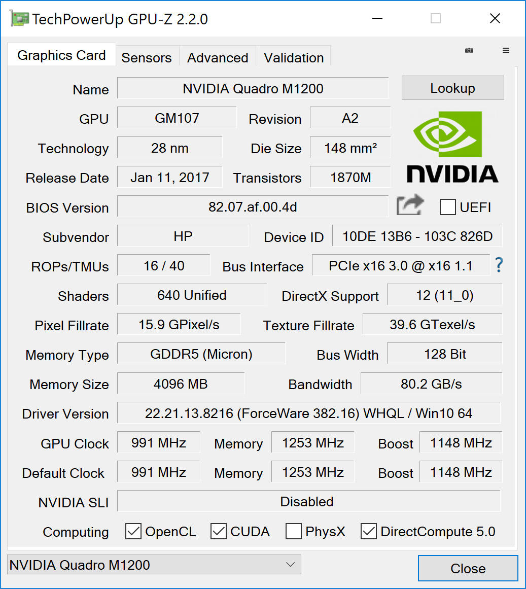 HP stattet das ZBook Studio G4 ausschließlich mit einer dedizierten Quadro-M1200-Grafikkarte von Nvidia aus. Diese verfügt über 640 Shader-Einheiten und 4 GB des schnellen GDDR5-Speichers. Während der Garfikkern mit GPU-Boost maximal 1.150 MHz erreicht, taktet der Speicher mit 1.250 MHz. Die in der CPU integrierte HD Graphics P630 lässt sich, wie zuvor beschrieben, nicht verwenden. Ähnlich wie die Vorgängerkarte Quadro M1000M basiert die neue M1200 weiterhin auf der Maxwell-Architektur, verwendet nun aber denselben Chip wie die alte M2000M sowie die Consumer GeForce GTX 960M (vorher GTX 950M).