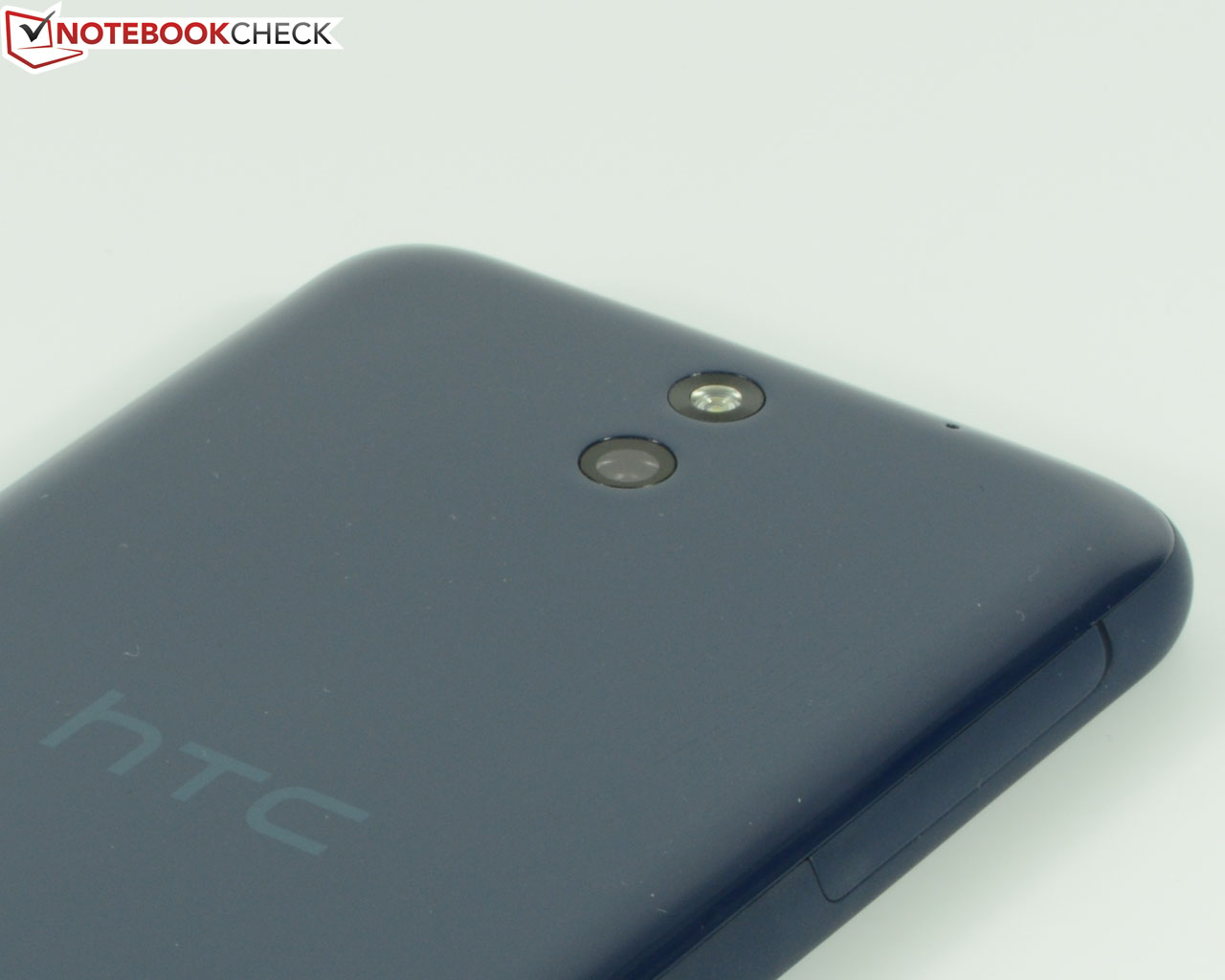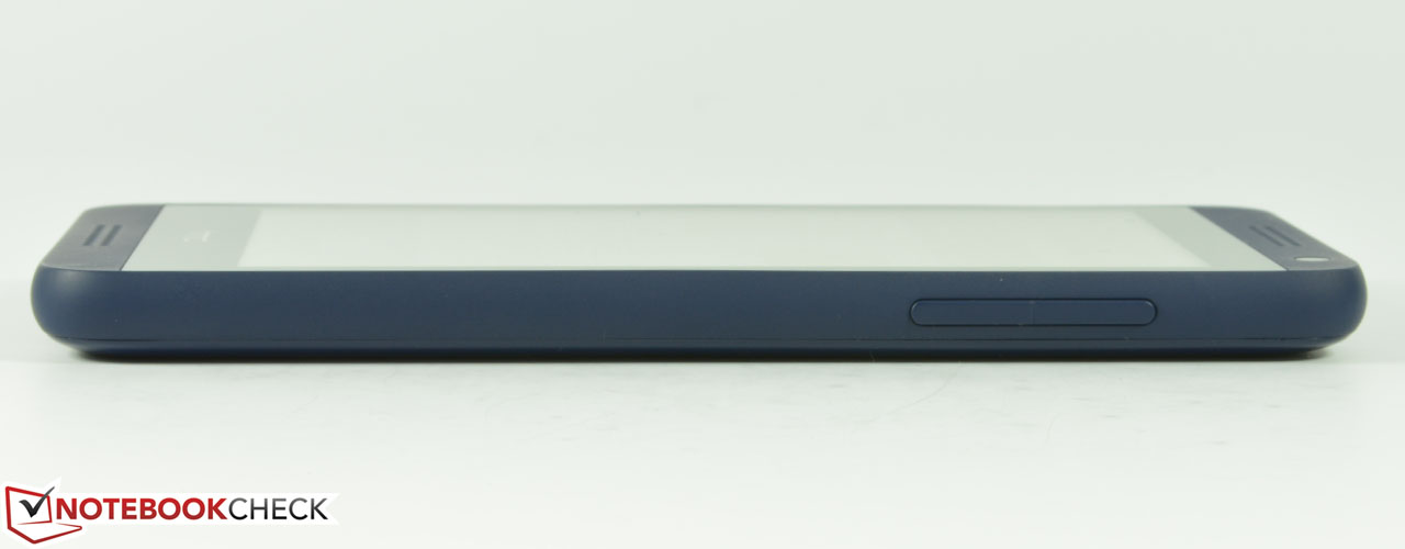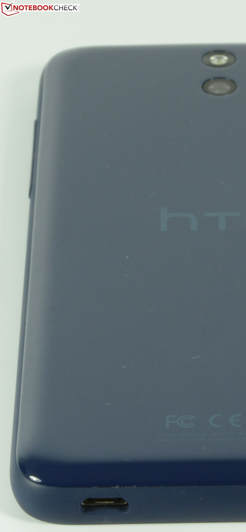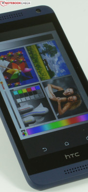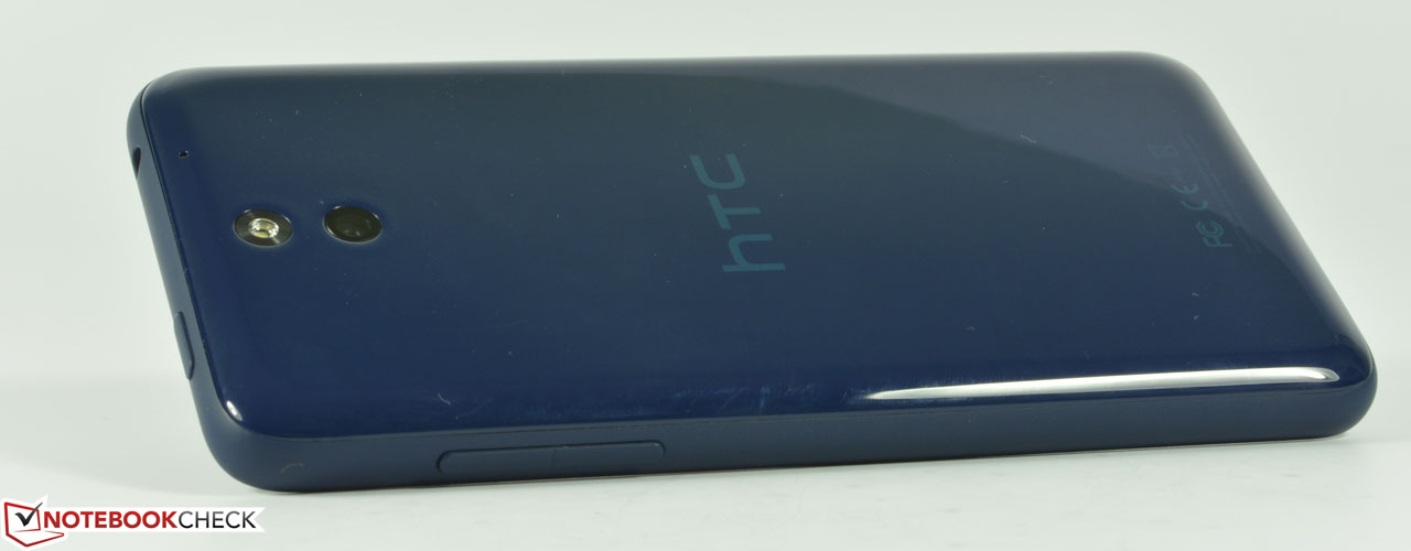 Das Gehäuse unseres dunkelblauen Testgerätes besteht aus stabilem Polycarbonat und wurde sauber verarbeitet. Der Verwindungstest zeigt eine hohe Steifigkeit des Gehäuses, einzig das Display verfärbt sich leicht bei starkem, praxisuntypischen Druck auf die Scheibe. Das Design orientiert sich an HTCs Firmenstil mit frontseitigen Stereolautsprechern. Wer es farbenfroh mag, ist bei HTC richtig, denn das HTC Desire 610 wird in Blau, Grau, Grün, Orange, Weiß und Schwarz angeboten.